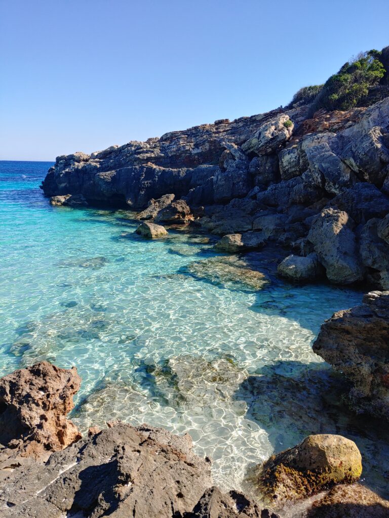 No creemos que podamos llamar «cala» a Es Caló Blanc pues es realmente pequeña y aunque tiene un mini trozo de arena, fundamentalmente el acceso al agua se hace desde las piedras/rocas. Hay escaleras habilitadas para volver a subir después del baño, pero si la visitáis, os recomendamos llevar escarpines.