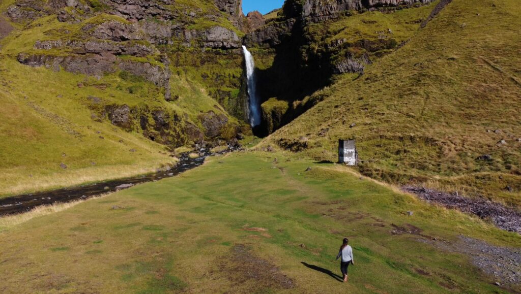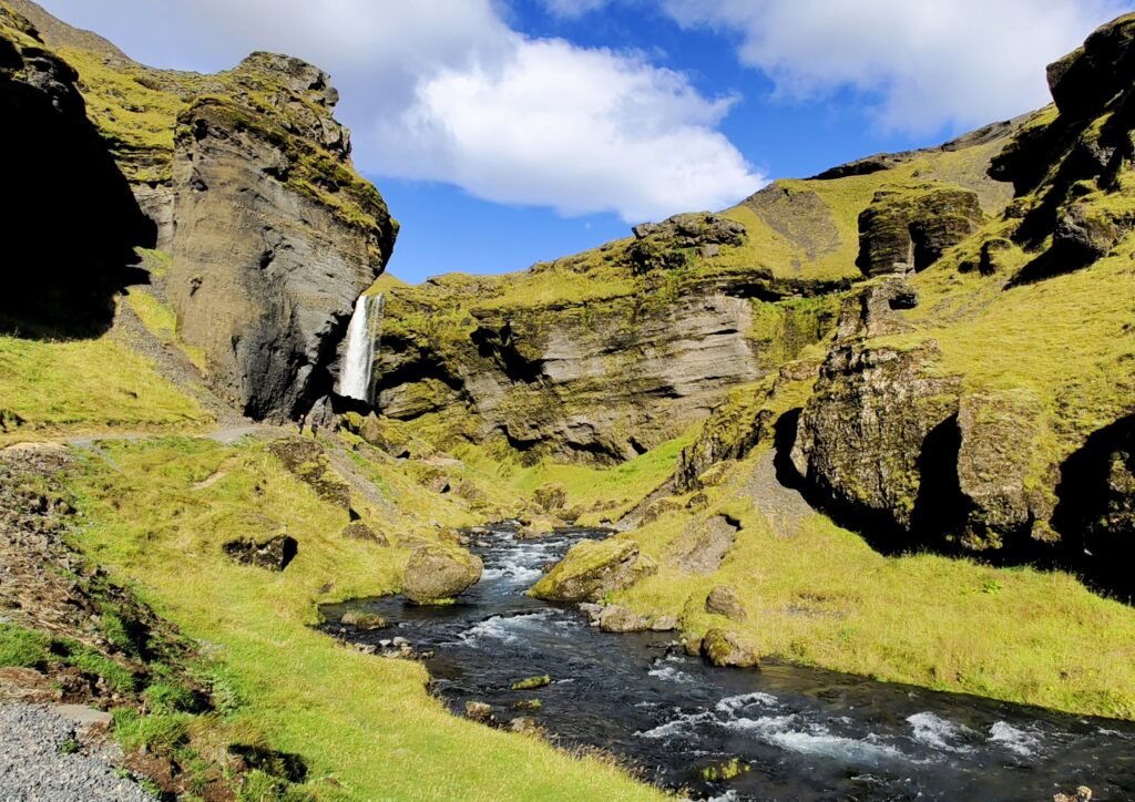 ¡La última cascada del día! Y de verdad que nos ha alucinado. Es menos conocida que la anteriores y cuando la visitamos no había demasiada gente. Tiene 20m de caída y al igual que en Seljalandsfoss, se puede pasar por detrás. La cascada es brutal pero el entorno, un cañón recubierto de musgo y un arroyo que lo atraviesa, son todavía más increíbles.