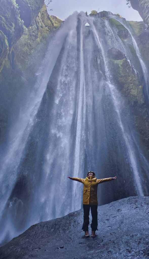 A unos 10 minutos caminando desde la Cascada Seljalandsfoss, se encuentra la cascada vecina Gljúfrafoss. Para llegar a ella hay que seguir el camino señalizado que sale de Seljalandsfoss hasta prácticamente el final. Justo a mano derecha veréis que hay un acceso, una abertura enorme en la montaña, y aunque parezca que no, el camino es por ahí 🙂 Se accede cruzando el riachuelo, caminando pegado a la pared y saltando por las piedras. En esta cascada te mojas pero bien ya que el agua te cae literalmente encima con bastante fuerza. ¡La sensación es increíble!