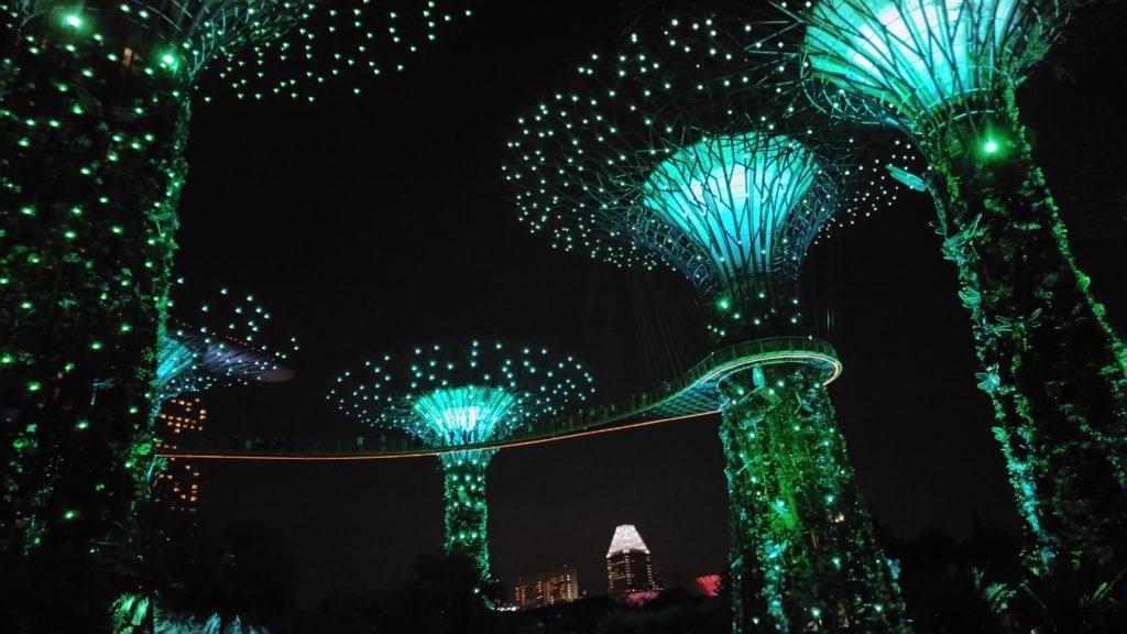 Cada noche hay un espectáculo de luces que merece muchísimo la pena ver. Los árboles se iluminan con distintos colores acompañados de música, ¡pura magia de luz y color!
